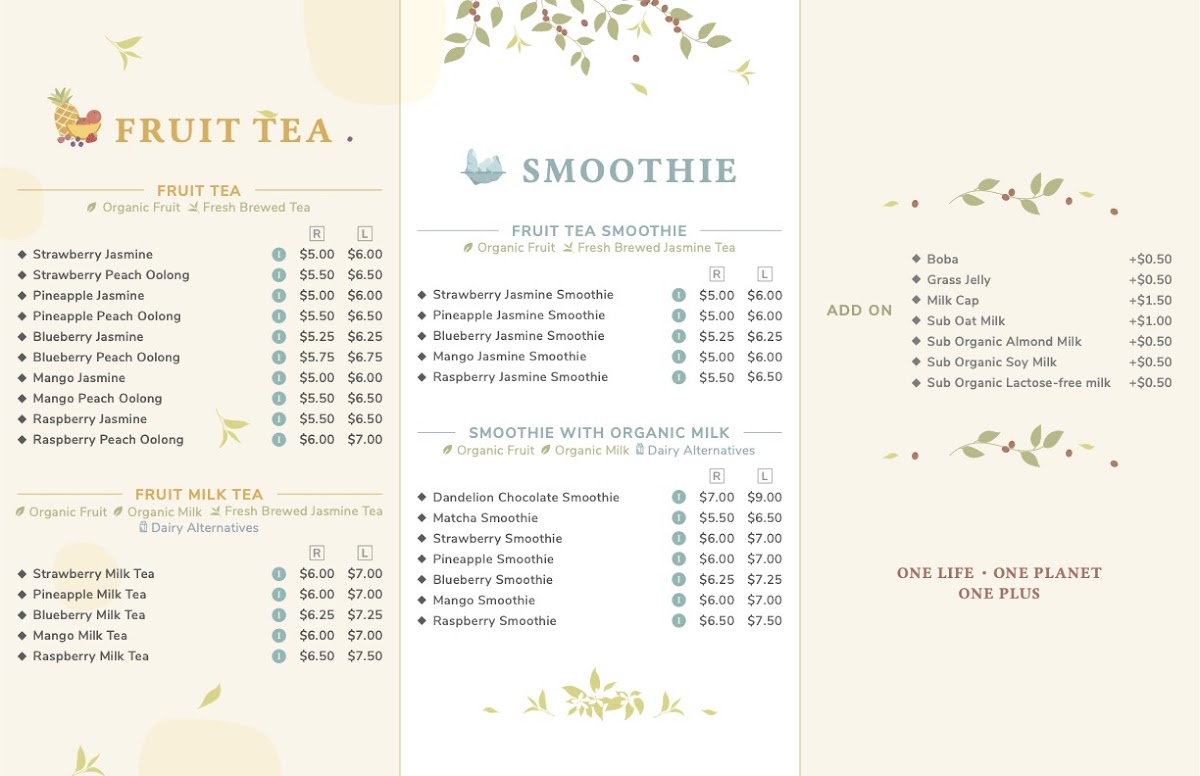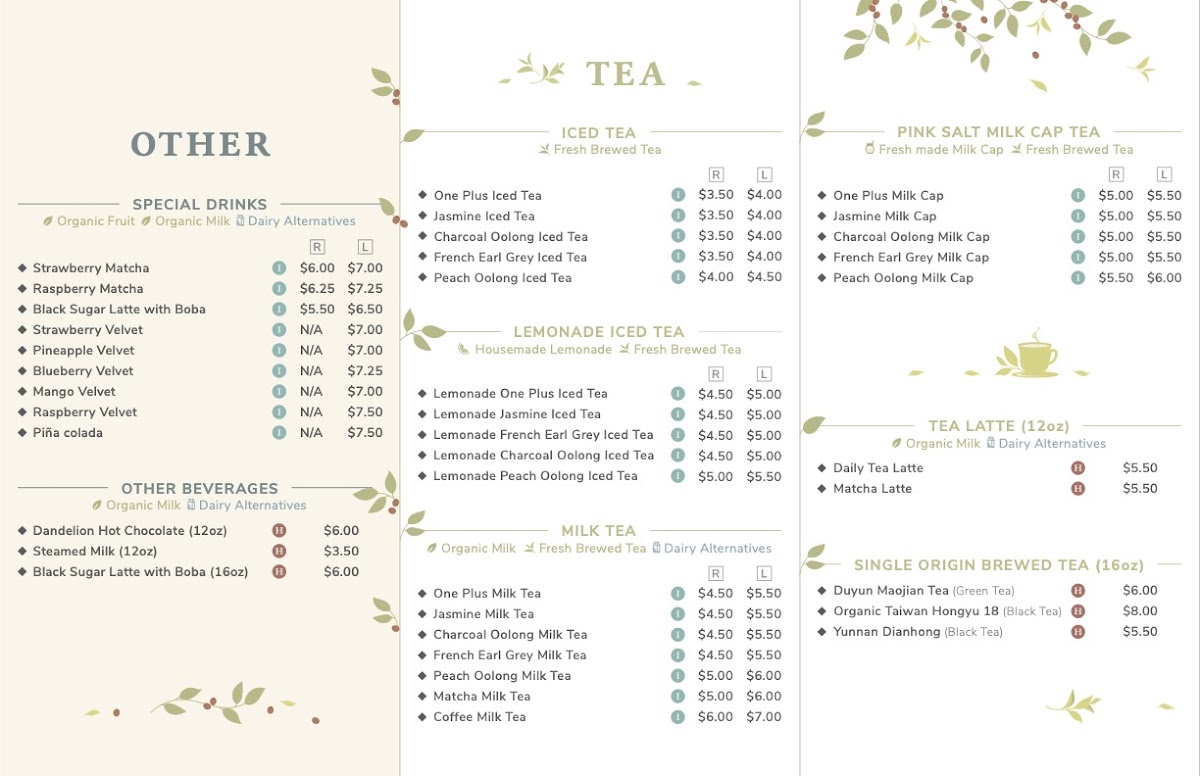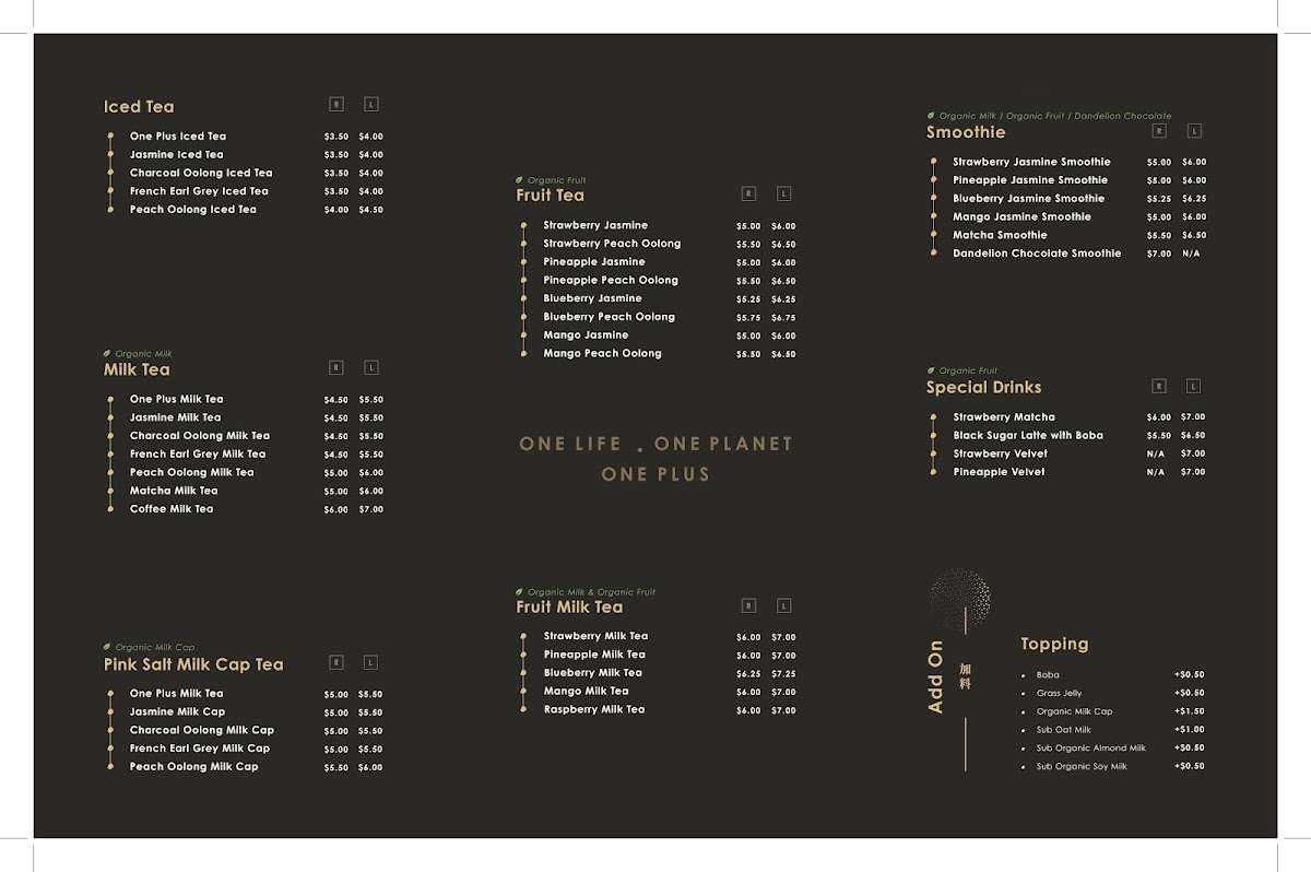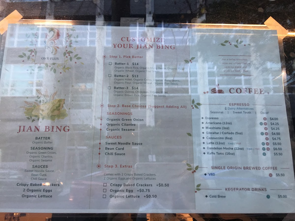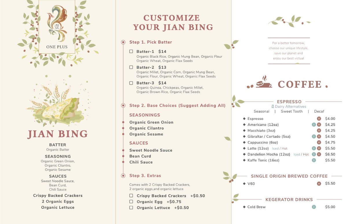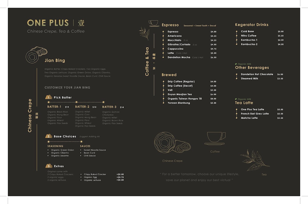 From my experience at One Plus, the menu is an enticing mix of creative takes on classic café fare and unique Asian‑inspired offerings. The heart of the food lineup is the savory Chinese crepes, particularly the signature Jian Bing variants like Crepe (Batter‑1) - $19.25, Crepe (Batter‑2) - $17.88, and Crepe (Batter‑3) - $19.25, each layered with eggs, crisp lettuce, flavorful sauces, and house‑milled grains for a satisfying bite. For a sweeter finish there’s the Vanilla Crepe - $17.88 and Match Crepe - $19.25, blending sweet elements with the same delicate crepe base. The drink selection complements the food beautifully, with coffee and tea options such as Americano - $5.88, Iced Latte - $7.62, and Organic Taiwan Hongyu #18 Tea - $11.00, alongside refreshing fruit and milk teas like Strawberry Milk Tea - $8.62 and Jasmine Milk Cap Tea - $9.00. Iced and flavored tea choices such as Lemonade Jasmine Iced Tea - $6.88 add a light, zesty counterpoint. Whether you’re craving a hearty crepe or a handcrafted beverage, the menu blends familiar café standards with distinctive twists, all at approachable prices that make it easy to linger and savor each item.